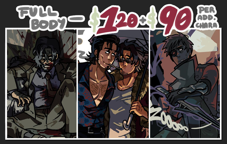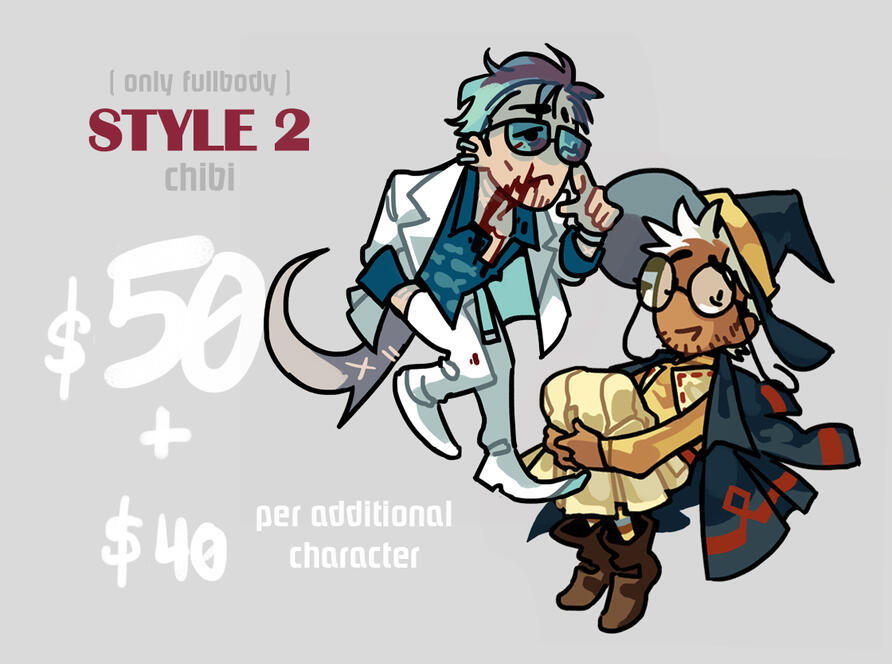 FULL BODY - $120 // +$90 per additional charactersimple colour backgrounds or simple pattern backgrounds will be applied to any of the above unless you specify you just want a white background!★ detailed backgrounds for any of the above start at $20 ! ★eg. - FULL BODY + DETAILED BACKGROUND - $140 // +$90 per additional character